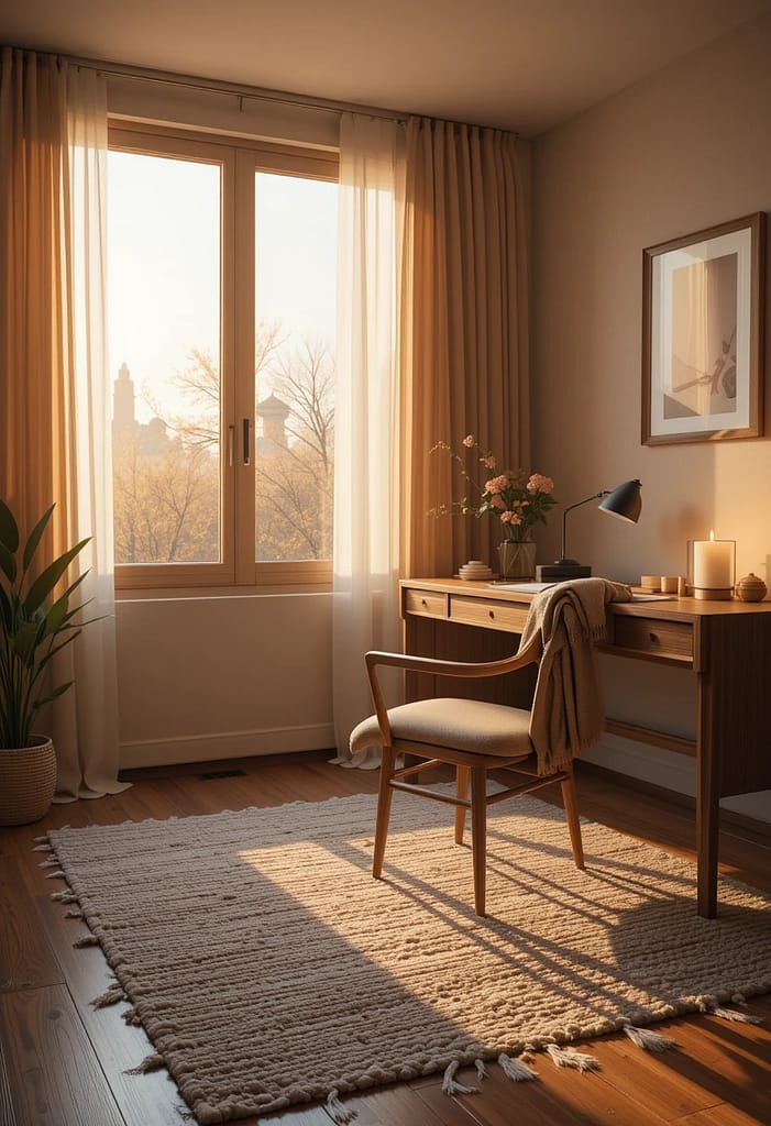 Make your office somewhere you want to be. A soft rug under your desk, a throw blanket over your chair, or curtains that frame your window can make the space warm and inviting. If you love scents, a candle or essential oil diffuser can create a relaxing vibe while you work.